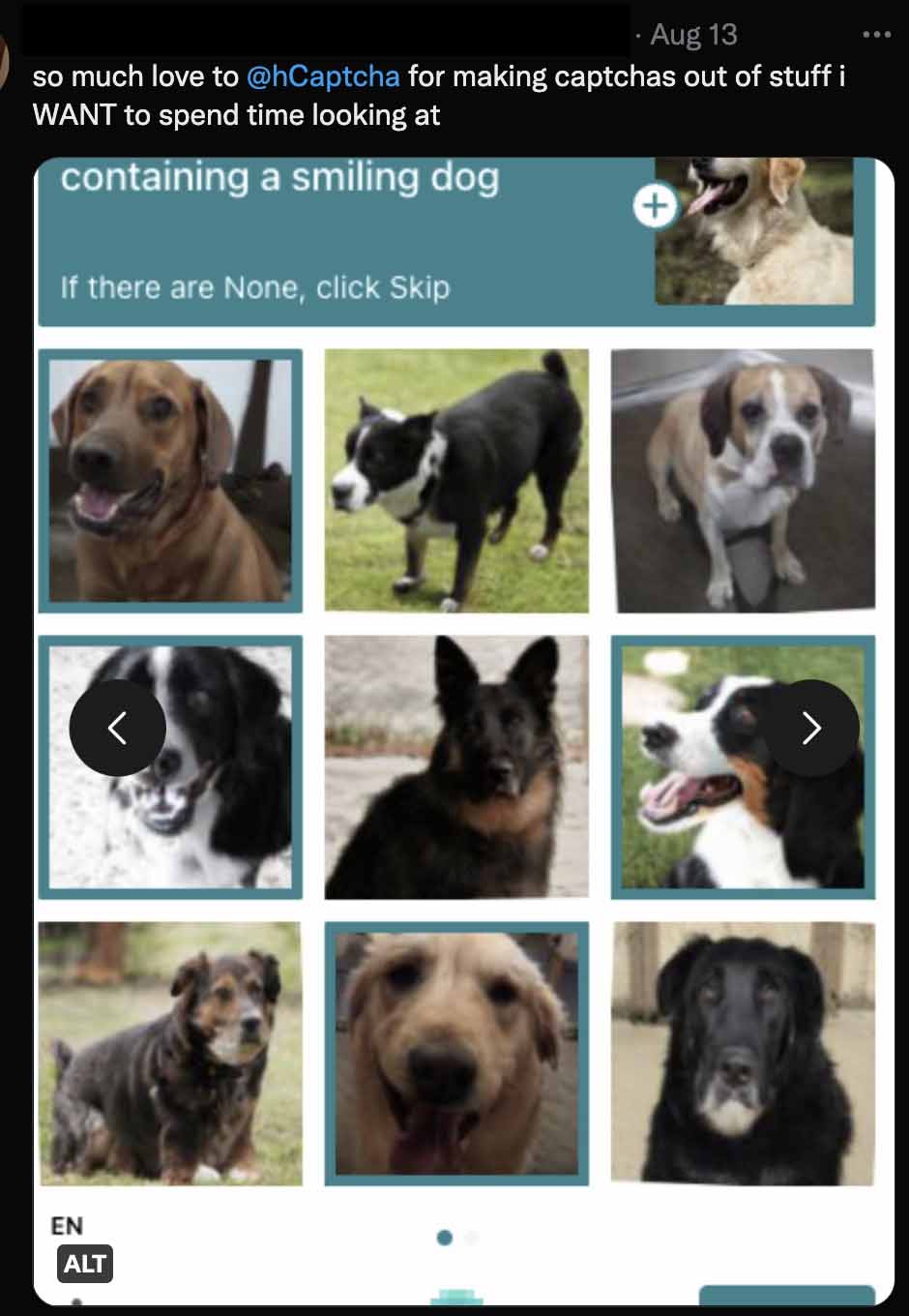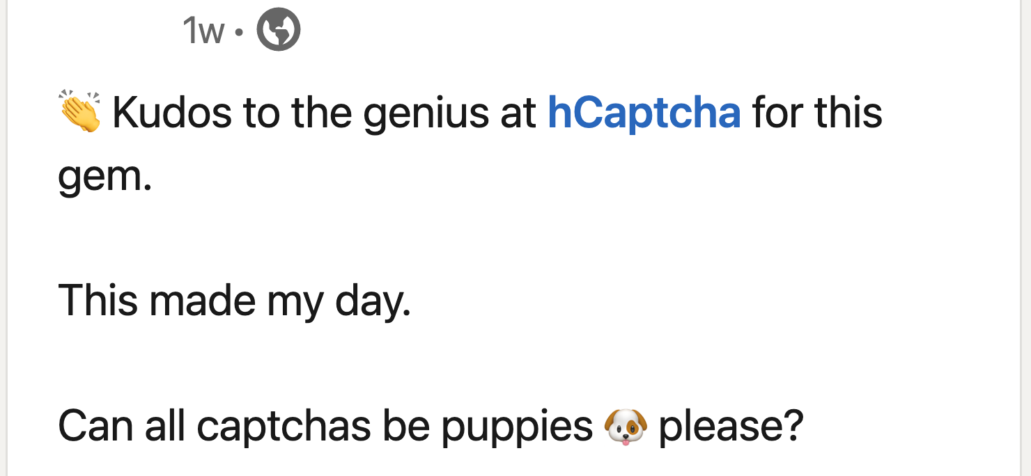 We thus adopted an explicit goal of making most people who see an hCaptcha challenge happier for having seen it, and have spent quite a bit of time working on and testing different ways to do this.