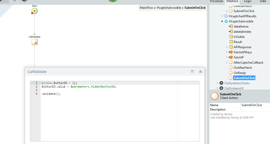 4. Add a new OnClick button event to trigger a client action that sets window.ButtonID to the value of the hiddenButton we created in the application. It does not necessarily have to be a button click event, but for this test that is what I used; Anything that would trigger the start of a client action will work.. Then we need to call validate() to actually trigger the rendering of the hcaptcha widget.