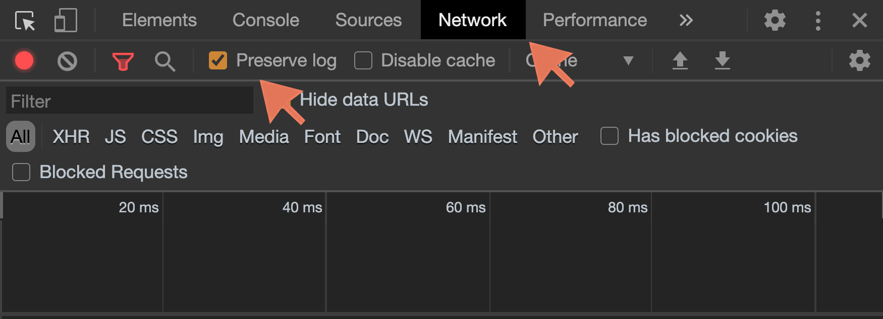 Step 2: Click on Network tab in Developer Tools. Check the "Persist logs" box at the top.